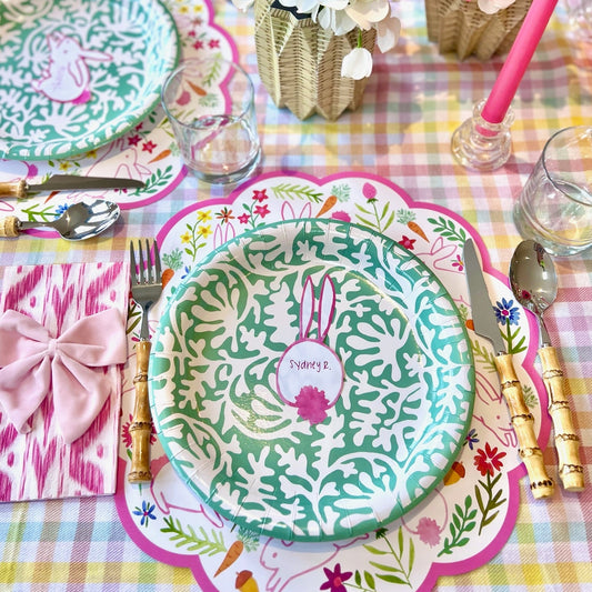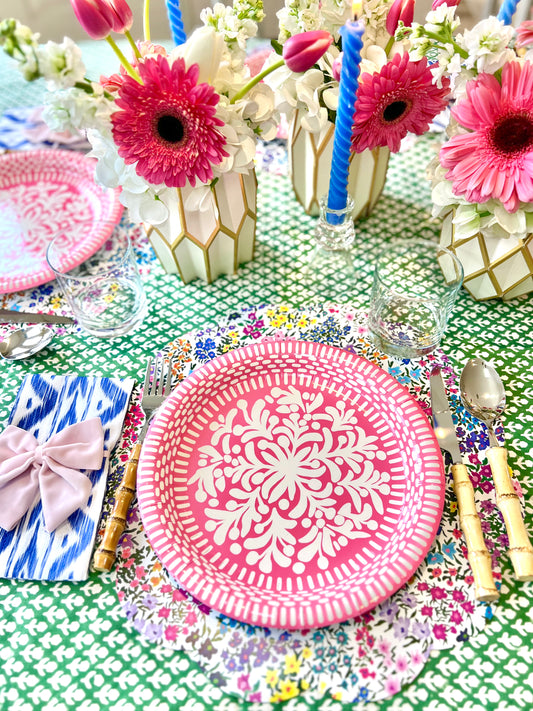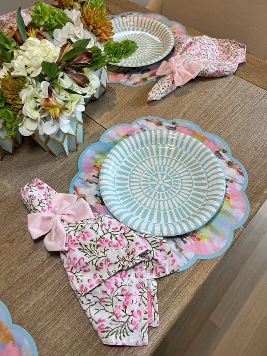 10" Gold Chinoiserie Heavy Duty Paper Plates and Light Pink Bow Napkin Ties Bundle