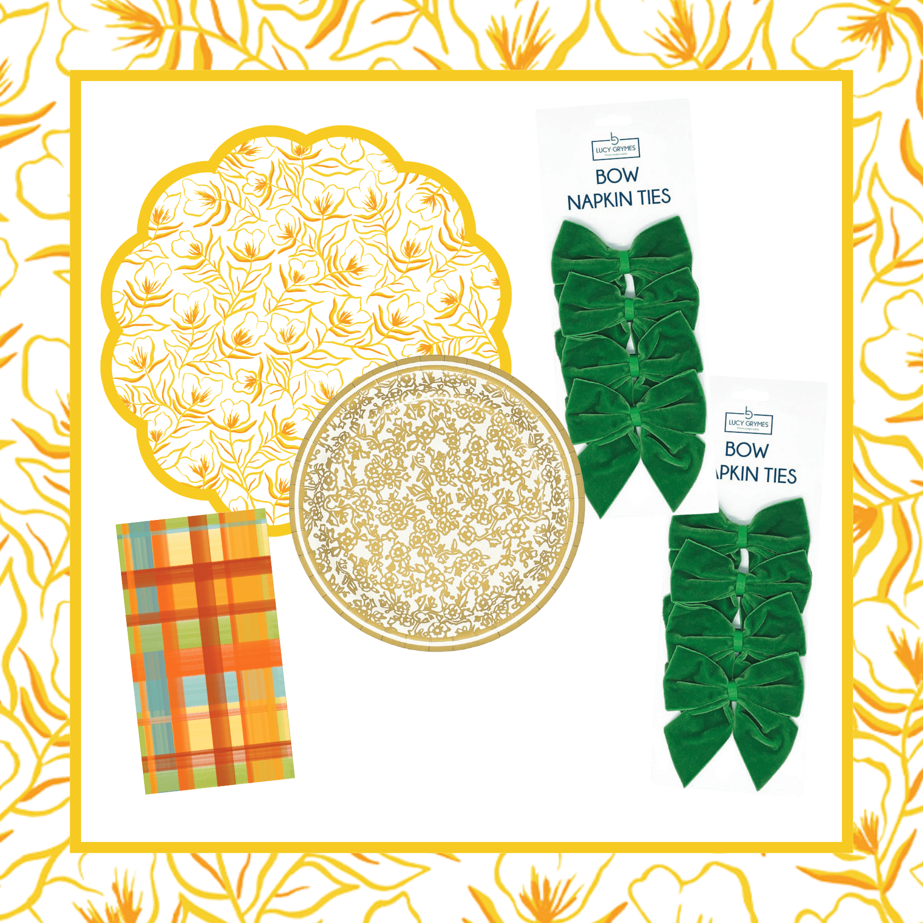 Golden Flower Table Bundle (Placemats + Plates + Bows + Napkins)