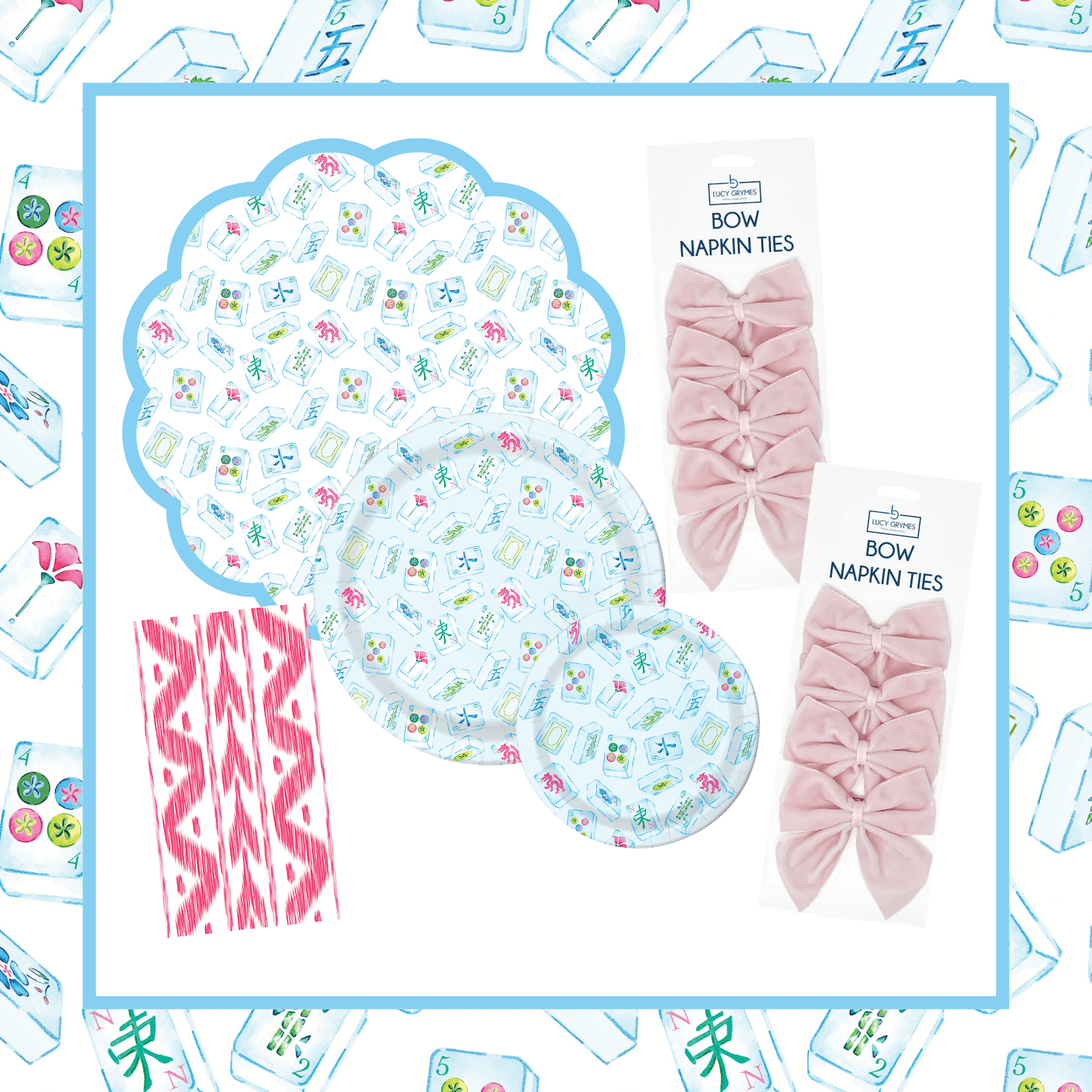 A playful tabletop bundle that doubles as a conversation starter. With graphic mahjong-inspired designs and coordinating premium paper plates, this set is perfect for game nights and themed gatherings.